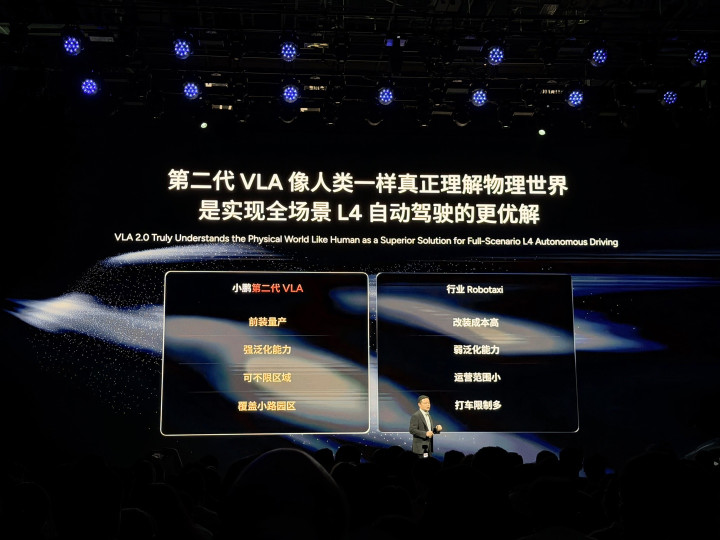据其介绍,搭载小鹏第二代VLA软件的Robotaxi已经通过第三方测试机构场地测试,即将开始公开道路测试。第二代VLA像人类一样真正理解物理世界,是实现全场景L4自动驾驶的更优解。对比行业Robotaxi,小鹏第二代VLA支持前装量产、强泛化能力,可不限区域运行,覆盖小路园区。